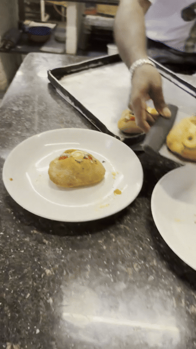 Back at Da Tita, Medora had got some fresh Loni (again, not ours) from the bakery and we were tasked now with filling up the bread with whatever stuffing we want and the restaurant will bake whatever we give them. I think Soul Travelling had some tie-up with Da Tita, coz the stuffing options we had were awesome. The idea was to actually make a panini with Loni as the bread. But Medora told us her technique which was quite cool, that is to make an incision in the top of the bread and stuff the fuck out of it. Da Tita had provided us with tons of ingredients, like pesto sauce, mayo, sundried tomatoes, cherry tomatoes, fried aubergine (baingan), caramelised onions, parmesan cheese, etc. etc. Both of us stuffed as much as we could into the little Loni, and then they went into the wood fired oven of the restaurant to get baked. AND IT TURNED OUT SO MAST OMG. Can’t believe something from my hands was tasty.